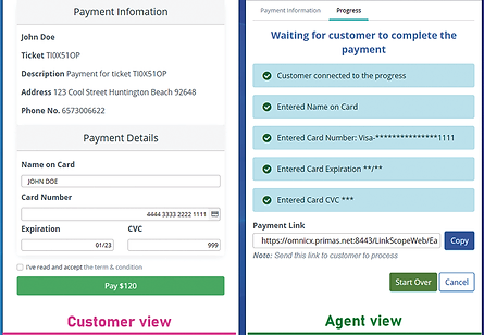 • Agents see only payment progress and confirmation—never the full card number, CVV, or expiration date.