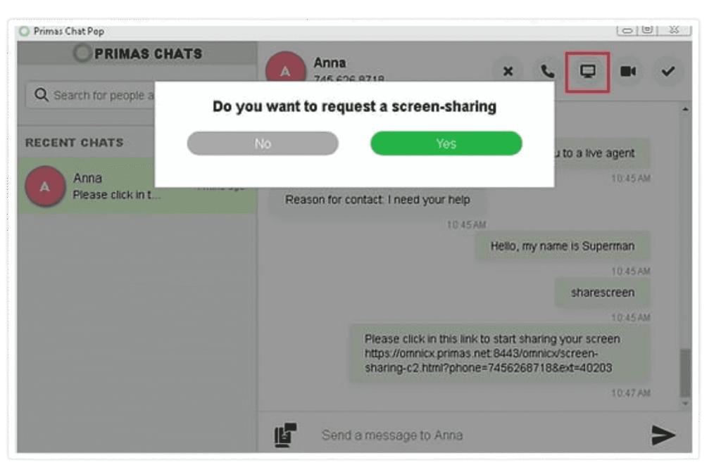Agents send a secure link via chat. The customer clicks the link and grants permission to share their screen instantly.