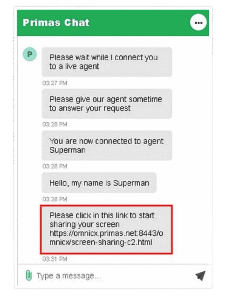 Send a secure link directly from your chat window. Customers can share their screen instantly without any downloads or installations.