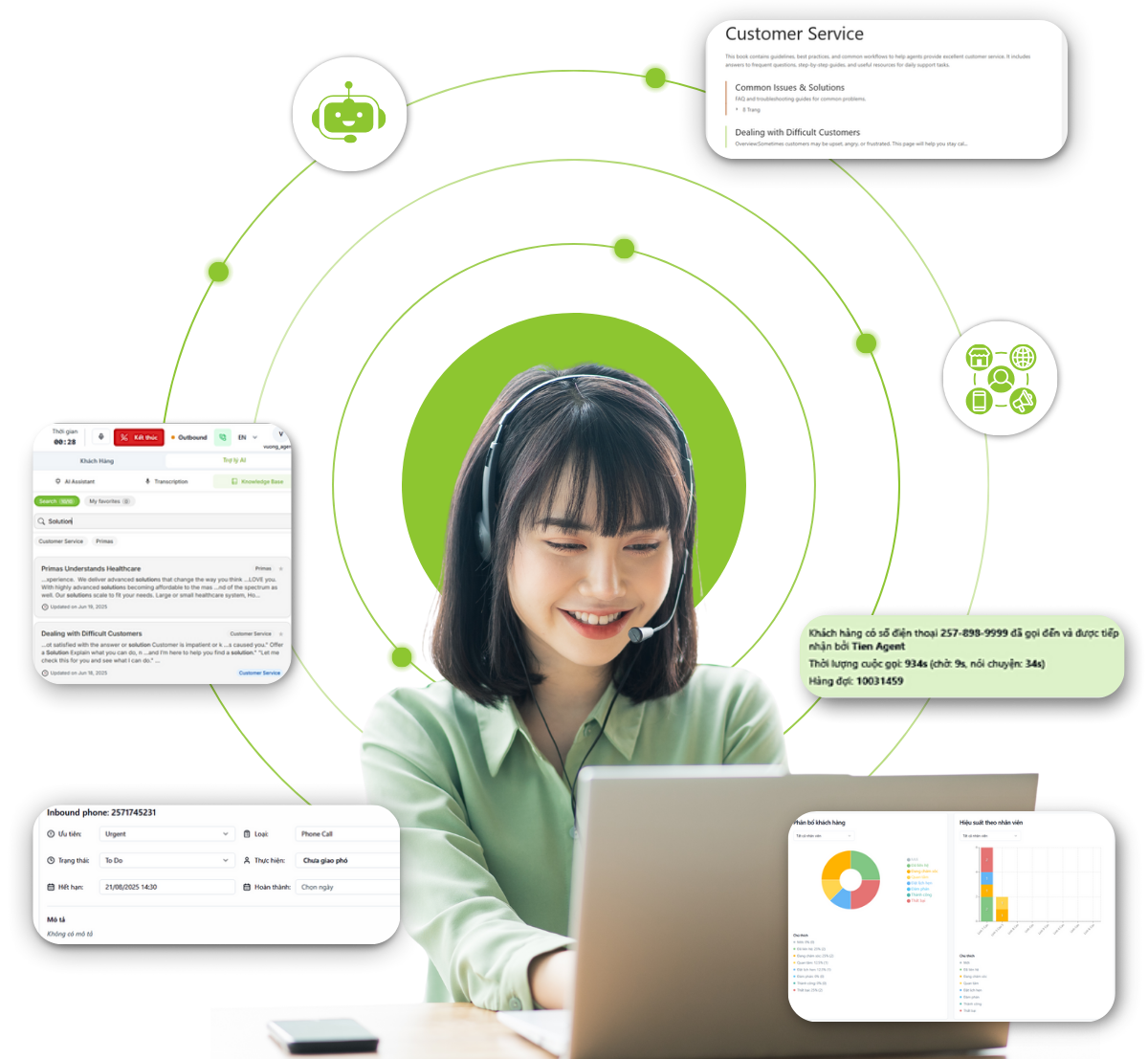 AI tự động ghi nhận, phân loại yêu cầu, gợi ý phản hồi thông minh dựa trên lịch sử khách hàng và kho tri thức doanh nghiệp.