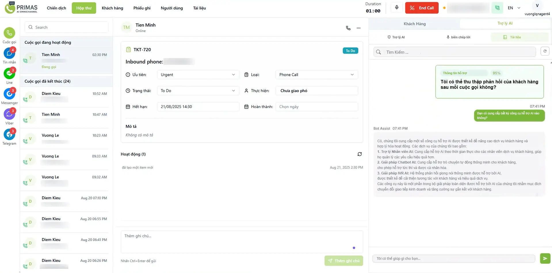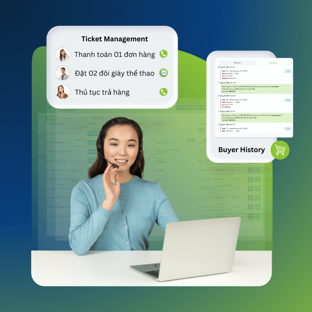 Khi có cuộc gọi hoặc tin nhắn đến, hệ thống sẽ tự động tạo ticket, lưu lại lịch sử tương tác và phân loại yêu cầu để xử lý theo quy trình phù hợp.