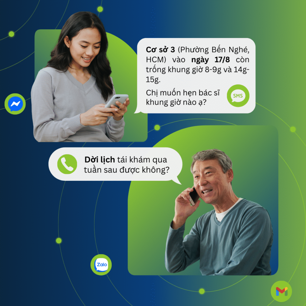 Bài toán: Khách hàng có 5 chi nhánh phòng khám tại Thành phố Hồ Chí Minh. Sau khi cho ra mắt ứng dụng điện thoại, phần lớn người bệnh vẫn gọi đặt hẹn qua hotline, tin nhắn và các ứng dụng MXH khác khiến nhiều lịch hẹn không được xác nhận hoặc xác nhận nhưng khách hàng hủy hẹn dẫn đến lãng phí nguồn lực.