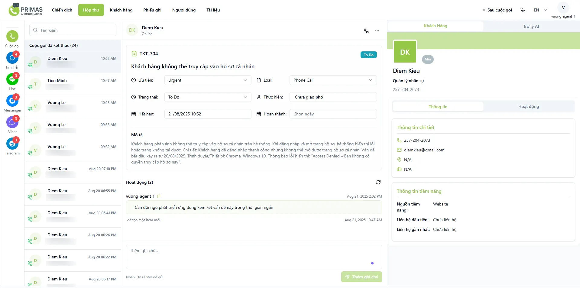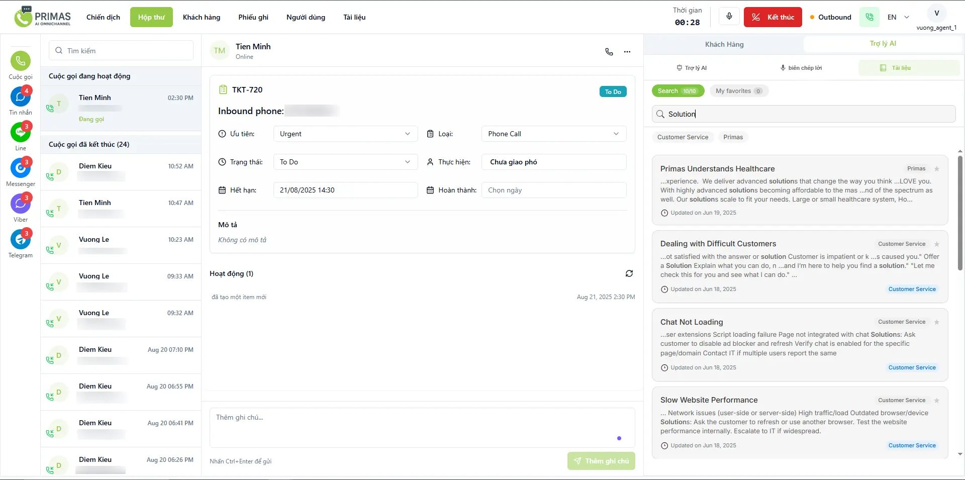 Giao diện được thiết kế hợp nhất, trực quan, giúp nhân viên CSKH thao tác dễ dàng, quản lý đa kênh, ticket và thông tin khách hàng trên một màn hình duy nhất .