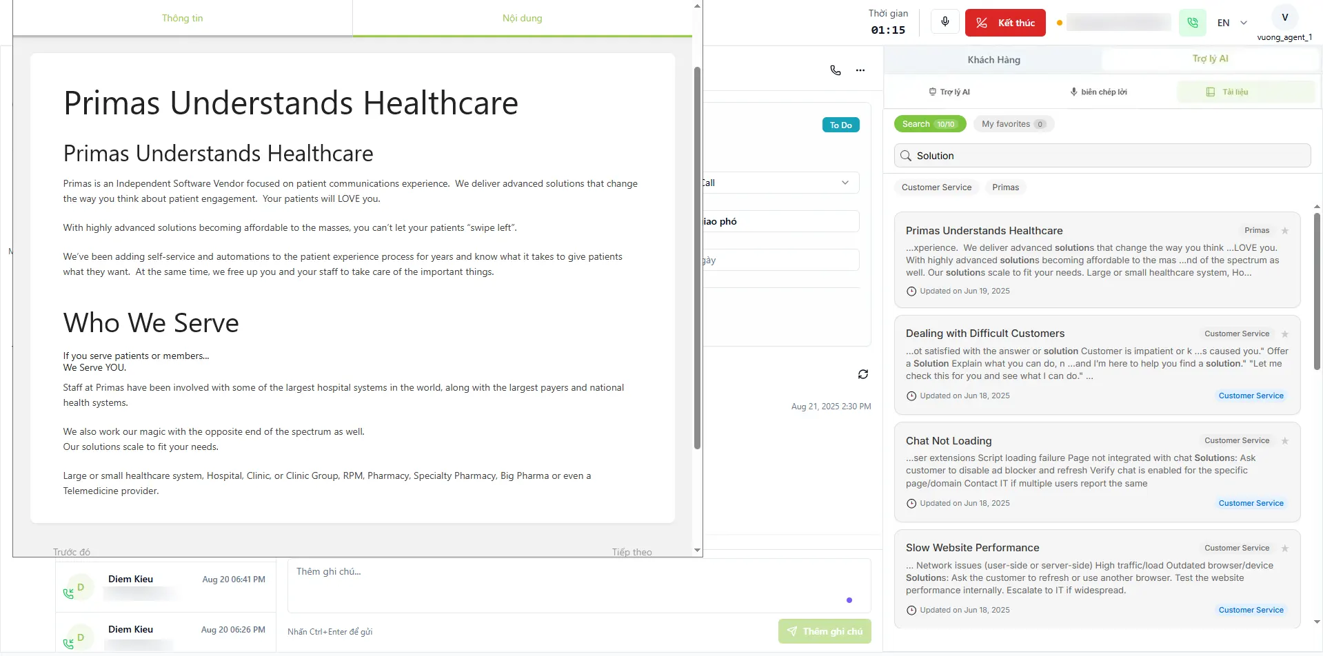 Nền tảng có thể tích hợp và khai thác kho tri thức hiện tại của doanh nghiệp, hoặc sử dụng kho tri thức mẫu của Primas, giúp nhân viên luôn có thông tin chính xác để hỗ trợ khách hàng.